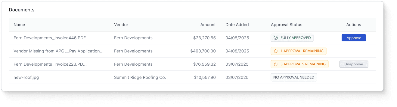 View all project documents and their approval status at a glance—track what’s ready, what’s pending, and take action instantly.