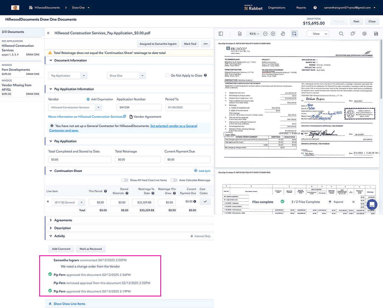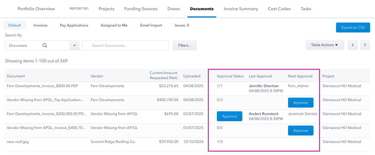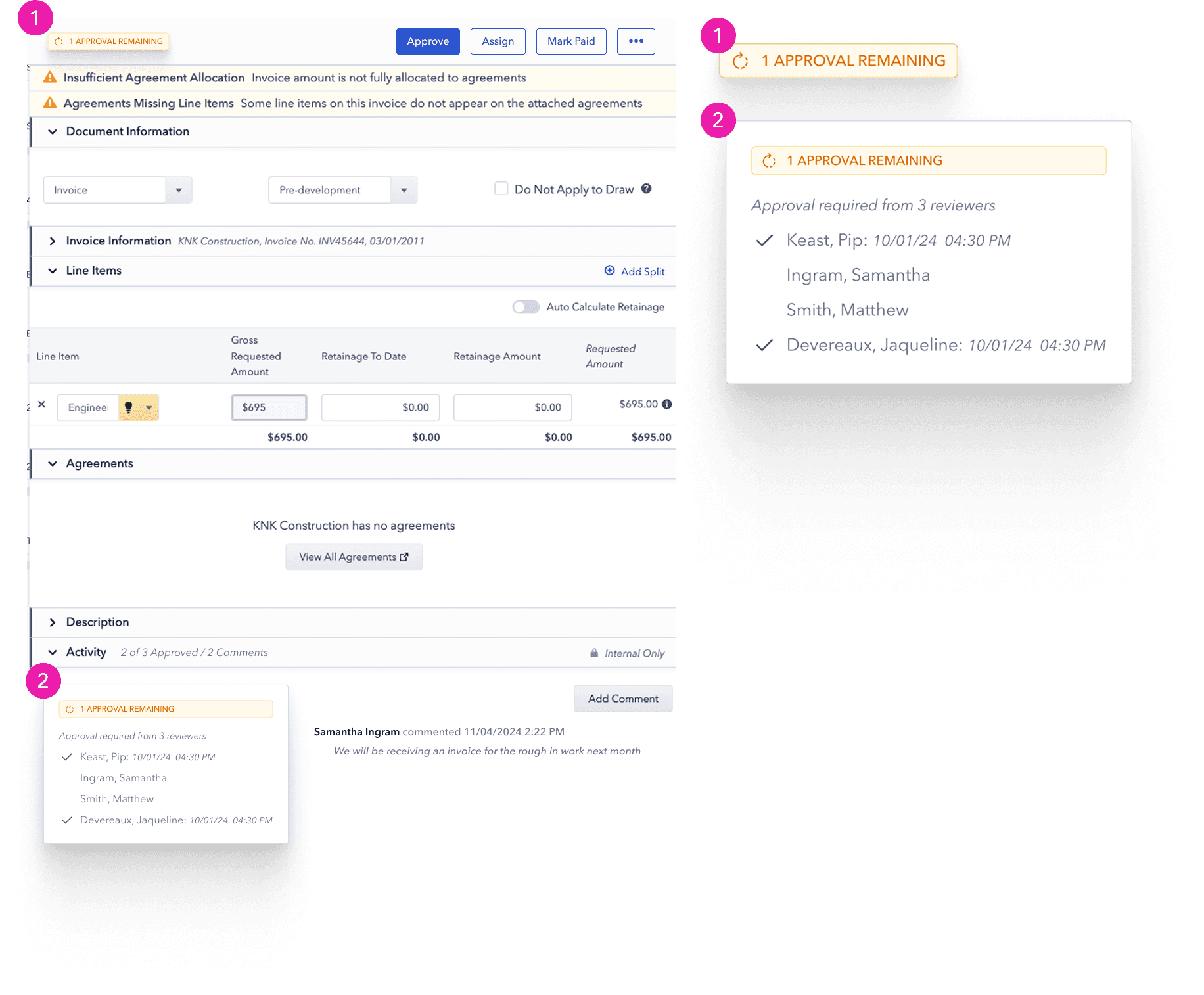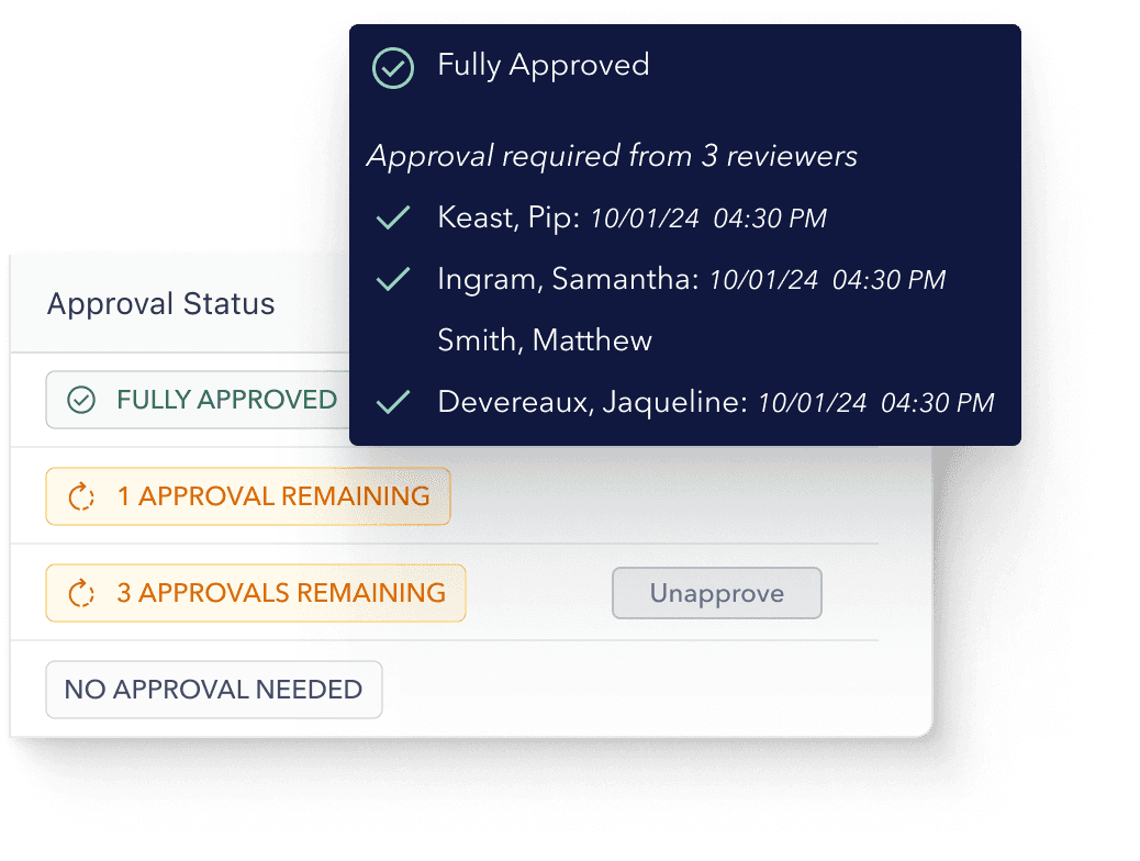 Hover tooltip reveals exactly who’s approved, who’s left, and when—so there’s no guessing what’s holding up a draw.