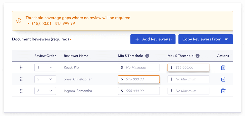 Set custom approval rules for each document type with flexible reviewer logic and optional thresholds