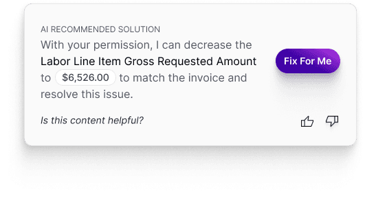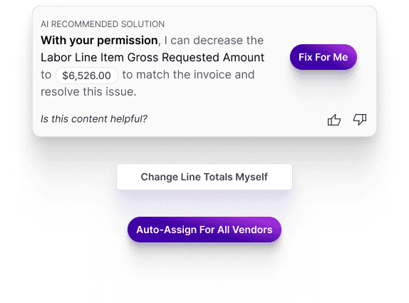 AI-generated suggestions are clearly labeled with phrases like “Fix For Me”, and "Auto-Assign" , always with a consistent “AI Recommended Solution” tag.