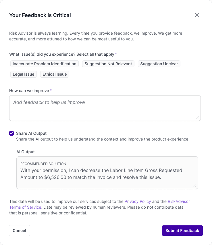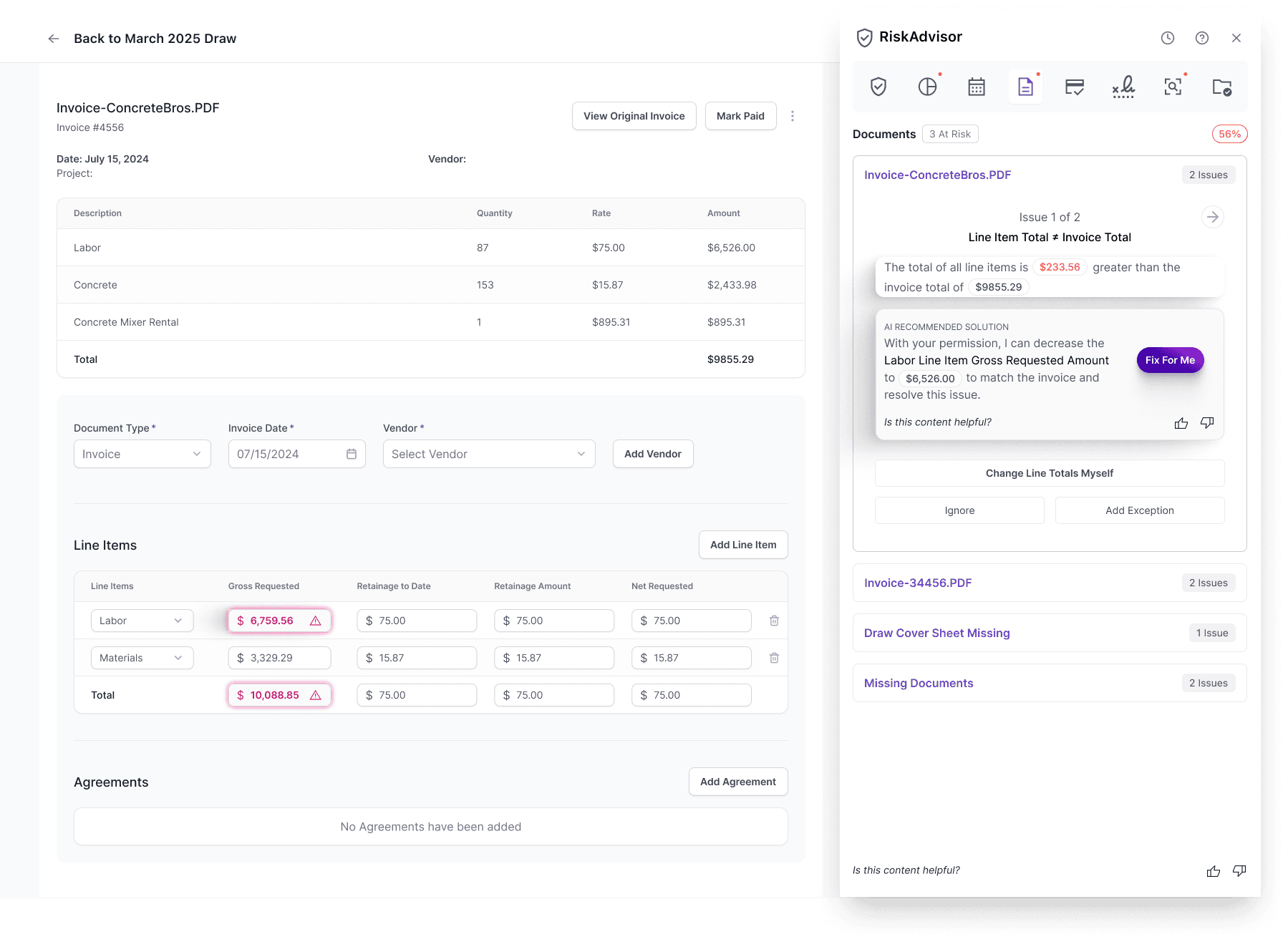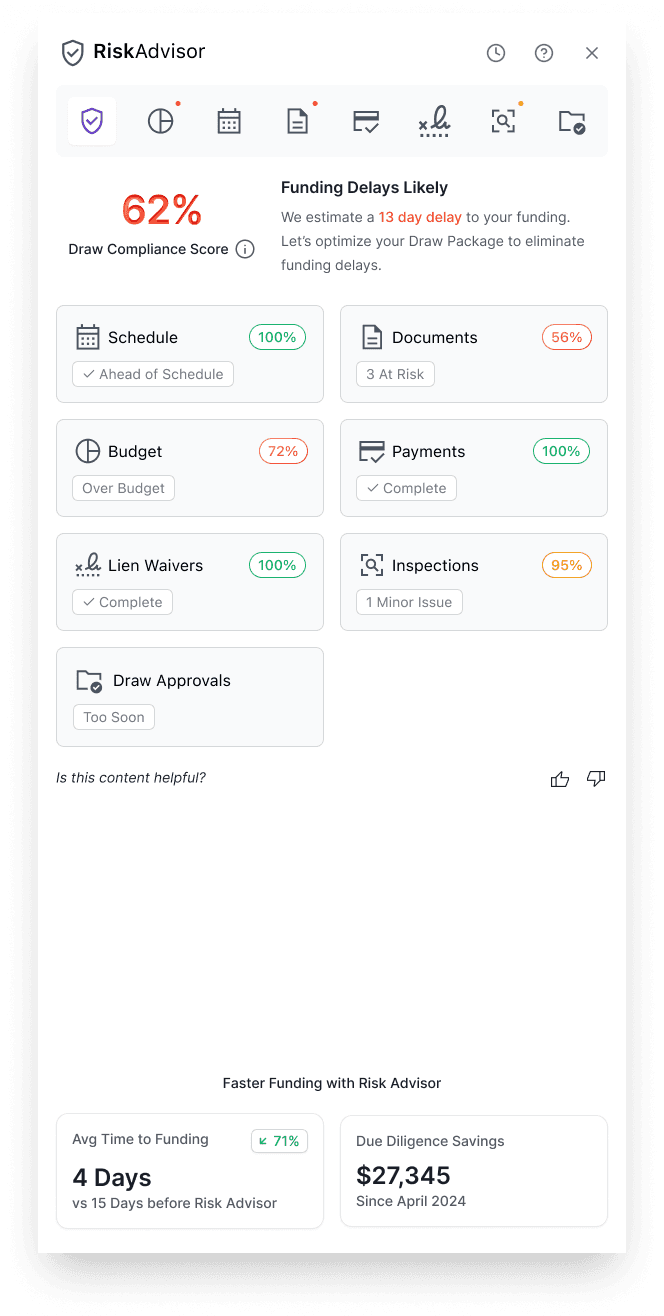 RiskAdvisor is designed to streamline monthly construction funding (draws) with AI. It detects risks, recommends resolutions, and helps teams fund faster — all while preserving trust and user control.