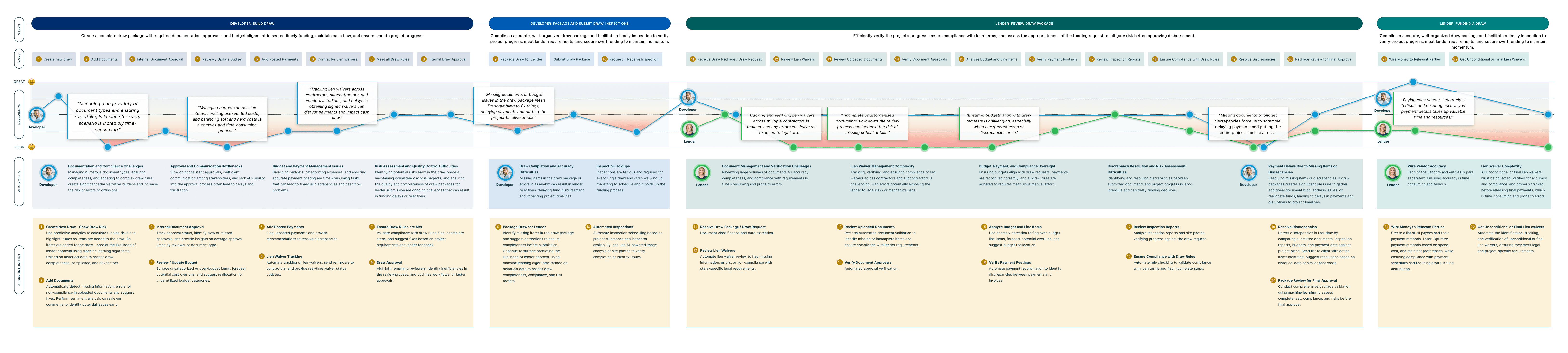 The user journey begins when the Developer creates a draw package and ends when the Lender distributes the requested funds. The map reveals exactly where trust breaks down and funding delays begin.